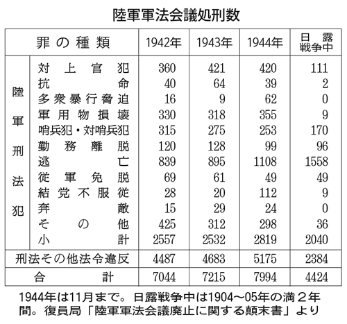 だが、こうしてつくられた「天皇の軍隊」は、侵略戦争の行きづまりとともに内側から崩壊していった。1943年当時の陸軍の極秘文書は、「上官暴行、逃亡、勤務離脱、抗命、辱職などの軍紀犯著しく増加」「対上官犯、収賄、横領犯の多発」と軍紀の崩壊を記録している。「対上官犯」とは上官への反逆行為である。「上官の命令は天皇の命令とされた皇軍の中にあって......それは天皇への不服従として重大犯罪とされた」(本多・長沼著『天皇の軍隊』)。42年以降の軍法会議で処刑された兵士の数だけで年間7千〜8千人近くに上った(表)。すでに敗戦前から天皇制国家は崩壊寸前となり、侵略戦争に動員された兵士たちの反逆が始まっていたのだ。