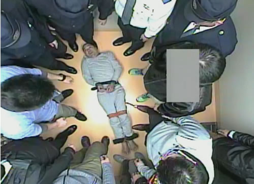 重大な事実が明らかになった。17年3月、ネパール人のシン・アルジュン・バハドゥールさん(当時39)が東京地検の取り調べ中に意識を失い病院搬送後に死亡した。警察官に制圧され、特殊な拘束具で手足を拘束された経緯の詳細が、ジャーナリストが入手した警視庁新宿警察署の留置施設内のビデオの映像(写真)で明らかになった。最も多い時点では16人もの警察官がアルジュンさんを「保護室」内で取り押さえ、「ベルト手錠」などで拘束したのだ。