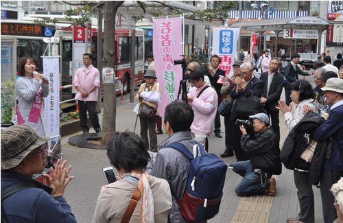 杉並区議会議員選挙が告示された4月14日朝、ほらぐちともこ選挙事務所で出陣式が行われ、正午にはJR西荻窪駅前でほらぐち候補が第一声を発した。出陣式には、都政を革新する会の長谷川英憲元都議、北島邦彦元杉並区議、国鉄千葉動力車労働組合の田中康宏委員長、三里塚芝山連合空港反対同盟の伊藤信晴さん、広島・安芸太田町議会議員の大江厚子さん、弁護士の高山俊吉さん、高円寺在住の武田崇元さん、沖縄から支援に駆けつけた青年が次々とほらぐち必勝への思いを語った。西荻窪駅前でのほらぐち候補の演説を紹介します。(編集局)