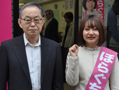 (写真 ほらぐちさん【右】は長谷川さん【左】の闘いを引き継ぎ選挙戦に入った【4月14日】)