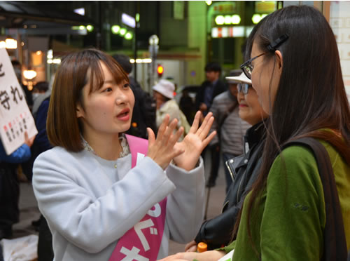 小柄なほらぐちさんが声を枯らし、その体から振り絞るように必死に訴える姿を見て、通行する人々が足を止めて演説に聞き入る。ほらぐちさんと同世代と見られる若い女性が演説を聞きながら何度も涙をぬぐい、通りがかった男性が「自民党をぶっ飛ばせ」とガッツポーズ。次々と寄せられる応援の声や握手を求める区民に応えるために、ほらぐちさんはたびたび演説を中断せざるを得ないほどだ。