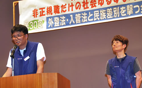 5・5全国入管集会に参加した韓国・民主労総ソウル地域本部のカンウンギュ政治委員長(写真左)の発言(要旨)を紹介します。(編集局)