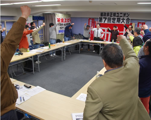 杉並区議選での洞口朋子さんの大勝利を引き継ぎ、4月28日、東京・秋葉原で郵政非正規ユニオン第7回定期大会が熱気あふれる中でかちとられました。「非正規は哀れな存在ではない。社会変革の主体だ」との齋藤裕介委員長の声高な訴えが大会の基調となり、新たな闘いに進むことが決まりました。