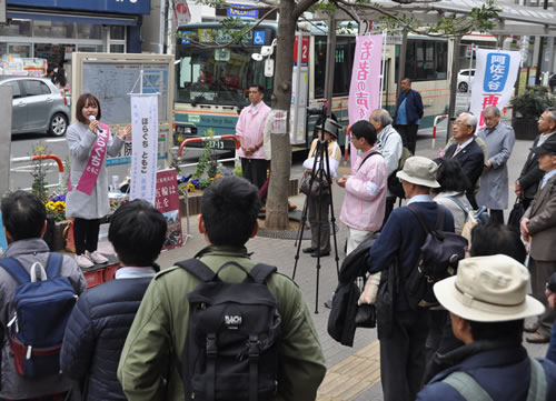(写真 杉並区民や支援者、「前進チャンネル」視聴者など多くの人々が洞口さんの訴えを聞きに集まった【4月14日 JR西荻窪駅前】)