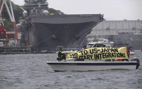 当日は、地元の「ヨコスカ平和船団」の「おむすび丸」と「コスモアイランド」の2隻に、大行進神奈川のメンバーも同乗し、海上抗議デモを闘った。強風と高波の中、神奈川県警、海上保安庁、米海軍の警備艇による監視・威嚇を打ち破り、18人でトランプ来横を弾劾した。