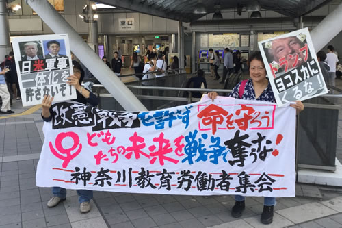 米大統領トランプの横須賀視察に対し、改憲・戦争阻止!大行進神奈川と横須賀実行委員会は、5月25日、27日連続的に横須賀中央駅前で「日米軍事一体化許すな」「中国・アジア侵略阻止」を掲げ500枚を超えるビラをまいた。「トランプは横須賀にくるな!」のトランプの顔写真入りのプラカードには、多くの外国人が賛意を示し、高校生たちも「トランプは嫌い!」「安倍も嫌い!」「ビラをまいてくる」と街宣に参加する劇的な展開になった。