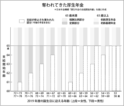 今進んでいるのは、厚生年金の報酬比例部分(上乗せ部分)の支給開始年齢の引き上げだ。男性の場合(公務員は男女とも)、2013年以降、報酬比例部分も60歳では受け取れなくなった。1959年度中に生まれ、今年度中に60歳を迎える男性の場合(公務員は女性も)、64歳に達する2024年度までは、年金は一切出ない。丸々4年分の年金が奪われるのだ。
