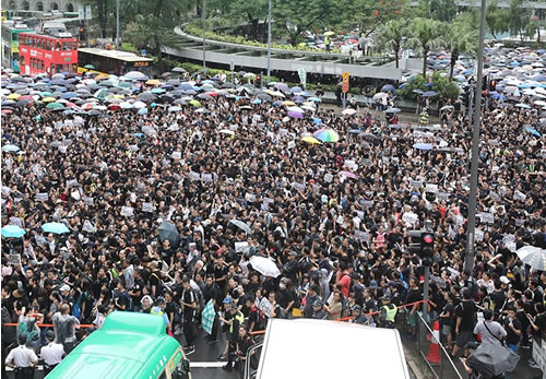 18日も、この流水方式が採られた。香港当局は、ビクトリア公園以外の集会を禁止し、さらにデモは認めなかった。しかし10万人しか収容できないビクトリア公園に170万人が集まれば、当然にも人があふれだし、道路を埋める。集会主催者は、「参加者を流す」として、そのままデモにしていく。膨大な民衆は、解散点に着くと再び出発点のビクトリア公園へと向かい、さらにデモ隊は二手に分かれていく。こうして「無限に循環する多方面のデモ」が終日行われたのである。