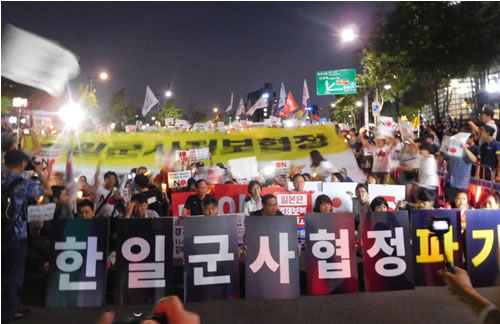 GSOMIA締結に向けた秘密交渉は、12年に当時のイミョンバク政権下で始まったが、暴露されて韓国民衆の抗議の声が噴出し、交渉中断に追い込まれた。それをパククネ政権が16年10月に再開し、わずか1カ月のスピード交渉で締結した。だがその時、すでに韓国ではパククネ政権のかつてない不正・腐敗を示す「チェスンシル・ゲート」が発覚し、民主労総のゼネスト決起を先頭にパククネ打倒の闘いが数百万人の規模で爆発していた。