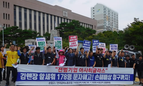 旭硝子は今日宣告された法の判決を履行しないというのであれば、結局より大きな社会的非難を受けるだろう。今日一審判決が出るまで、178人だった非正規職労働者は23人だけ残った。資本の不法派遣に対して、労働部、検察は時間を先延ばしした。裁判所ももたもたした。その結果被害を受けたのは労働者だけだ。現代起亜、韓国GM、道路公社不法派遣の問題も変わらない。労働部、検察、裁判所は、不法派遣の共謀者だ。