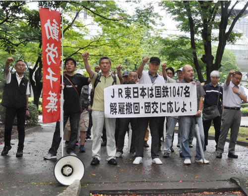国鉄分割・民営化による1047名の国鉄労働者の解雇は、国鉄労働運動をつぶすために強行された。動労千葉・動労総連合は30年を超えてこれと対決し続けた。そして、2015年6月の最高裁決定で、動労総連合組合員を解雇するために作られた不採用基準の策定は不当労働行為であったという判決を確定させた。さらに動労総連合は、この不採用基準がJR設立委員会によって作られた事実を暴いた。これは、1047名解雇の責任は国鉄にあるとされてきた、それまでの最高裁判決の枠組みを根本から突き崩すものだった。この新たにつかんだ事実をもとに、動労総連合は昨年5月、1047名の解雇撤回と、解雇撤回に向けた団体交渉をJRに求めて、千葉県労働委員会に申し立てた。ところが県労委は、冒頭から一切の審査を拒否すると言い出し、今年5月には申し立てを全面却下する不当な決定を出してきた。本来は労働者の団結権を擁護すべき労働委員会が、安倍政権とJR資本を救済する機関に成り下がったのだ。
