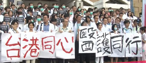 8月22日、台湾大学病院労働組合と台北市医師職業労働組合は台湾大学病院の前に集まり、「台湾の医師も看護師も同じ心、ともに進みます」との横断幕を掲げて、香港の労働者民衆とその支援に従事する医療関係者へ熱いエールを送った。声明文では「抗議活動に参加した医療関係者が警察との衝突で失明している」と弾劾し、「市民の生命と健康を守ることがわれわれの価値」であると述べて、香港政府を非難している。