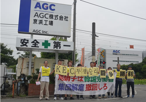 この日の行動には韓国の公共放送MBCも取材に訪れ、オスイル副支会長と旭共闘会議の山本弘行議長(動労千葉国際連帯委員会)にインタビュー。日韓労働者が国境を越えて資本と闘う姿は翌日韓国で報道された。本社前では、初めての試みである座り込みやスタンディング。「解雇された労働者を即刻正規職として雇用しろ!」という訴えが響き渡った。旭支会は新たに「裁判所も認めた!AGCは直接雇用を履行しろ!」という黄色いゼッケンを持参。通行する労働者の注目を集め、マイクでの訴えとビラまきを行いながら一日闘いぬいた。