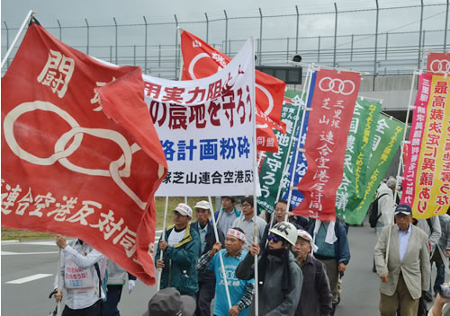 成田空港会社は、A滑走路の運用時間延長を10月末から強行しようとしています。1時間延長して深夜0時まで飛ばし、午後10時台の便数制限も撤廃して発着回数を現在の3倍にする暴挙です。羽田空港でも、来年3月29日からの増便で都心上空を飛行する新たなルートの運用がもくろまれ、5本目の滑走路建設も取り沙汰されています。私たちは、新たな住民組織をつくって立ち上がる成田騒音下住民と連帯し、羽田新ルート直下の住民の怒りとひとつになって闘います。住民との約束を反故(ほご)にし、騒音被害や事故・落下物の危険を何ら顧みない首都圏空港機能強化・滑走路建設は、軍事空港化に行き着くものです。反戦・反基地の闘いと一体で空港機能強化策を阻止しましょう。
