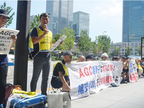 AGCの対応に怒りをたぎらせ、直ちに本社前で宣伝行動を開始。動労千葉の中村仁執行委員も参加し、群馬合同労組の清水彰二委員長(旭共闘会議事務局長)をはじめとする労働者が次々とマイクで訴えた。