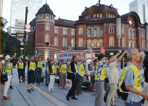 午後4時には宣伝カーも合流し、大音量のアピールがAGCを直撃した。その後の東京駅前街宣には青年労働者や学生も駆けつけ、約40人の大行動に。大注目を集め、第5次日本遠征闘争を締めくくった。