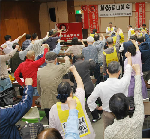 10月26日、部落解放東日本共闘会議と全国水平同盟杉並支部が主催する狭山集会が開催され、東京の全水道会館に60人が集まった。