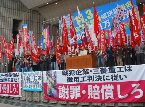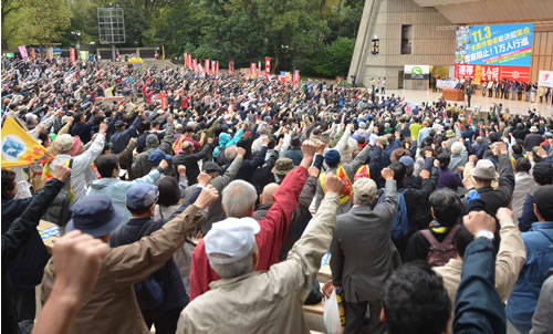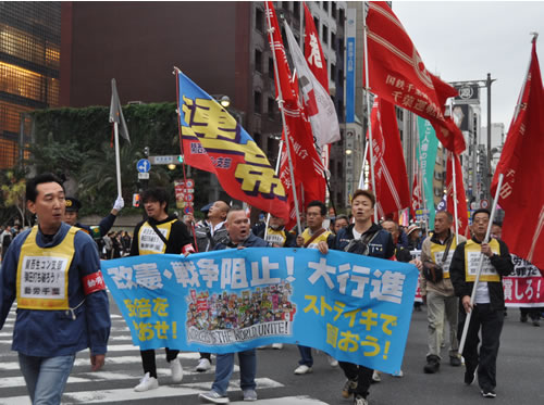 11月3日、東京・日比谷野外音楽堂で「11・3全国労働者総決起集会/改憲阻止!1万人行進」が開催され、全国・海外から会場内外を含め3900人が結集した。集会は、呼びかけ3労組の一つである全日本建設運輸連帯労働組合関西地区生コン支部への大弾圧を、全労働者・労働組合への攻撃としてとらえ粉砕する闘いを第一の課題として掲げた。さらに「労組のない社会」を狙うJRの攻撃と対決する国鉄闘争を貫き、今国会での改憲発議絶対阻止へ闘う労働運動をつくり出すことを共に決意した。集会後、銀座から東京駅までのデモを闘った。集会に先立ち東京駅・丸の内の三菱重工本社前で街頭宣伝が行われ、安倍政権の民族排外主義を打ち破る日韓連帯を軸とした国際連帯行動がかちとられた。(関連記事2面)