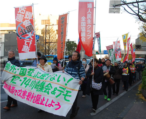 12月14日、川崎市内で、「『排外』・『国益』に屈しない12・14川崎集会&デモ」を婦人民主クラブ全国協議会と合同労組かながわが「国際連帯で改憲・戦争を阻止しよう」と呼びかけて開催しました。在日朝鮮人の集住地域でもある川崎・桜本で2017年に日本軍軍隊慰安婦問題をめぐる「日韓合意」に反対する集会とデモを開催して以来、今回は3回目です。