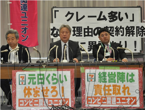 昨年12月20日、セブンイレブン資本は、一線を越える許しがたい攻撃に踏み出してきた。「時短決起」を先頭で闘ってきた東大阪南上小阪店オーナー松本実敏さんに対して、12月31日付けで契約解除を通告してきたのだ。時短をやるとこうなるぞという見せしめであり、さらには全国で巻き上がった「正月くらい休ませろ!元旦ストライキ」に対して、ストを拡大させないという攻撃だ。この攻撃に対し、コンビニ関連ユニオンは、年末10日間、契約解除阻止に向けた大決戦を闘った。27日には松本さんとともに記者会見を行った。