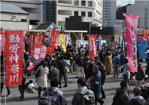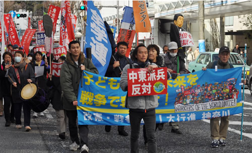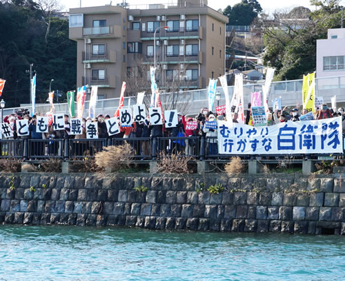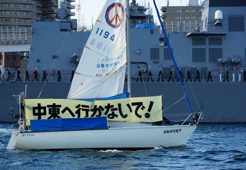 2月2日、海上自衛隊の護衛艦「たかなみ」の中東海域への派兵が強行され、同艦の母港がある横須賀ではその前日から2日間にわたって抗議行動が闘われた。隊員の家族が「行かないで!」と悲痛な声で訴える中、「自衛官も一緒に声を上げ、戦争をとめよう」と呼びかける行動が陸上と海上から同時に行われた。