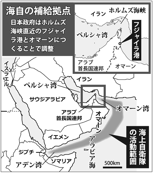 安倍は1月13日、アラブ首長国連邦(UAE)のムハンマド皇太子と会談し、UAE東部フジャイラ港を海自部隊の補給拠点とする方向で調整した。オマーンにも補給拠点をつくり、これらの拠点から燃料や食料の補給を行う予定だ。いずれも最も軍事的に緊迫するホルムズ海峡に近い。昨年12月の閣議決定では、自衛隊の活動範囲は「オマーン湾、アラビア海北部、アデン湾」の3海域の公海とされたが、17日の国会答弁では、海上警備行動が発令されれば「ホルムズ海峡での活動も排除しない」(河野防衛相)としている。