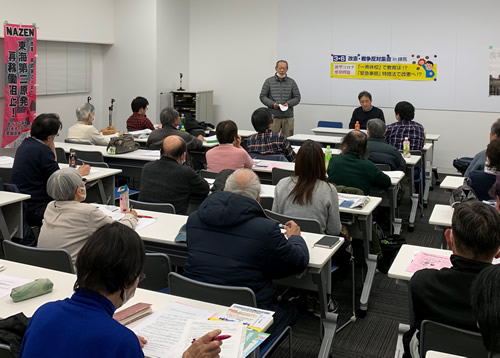 「君が代」不起立を続ける特別支援学校教員の田中聡史さんを招いたこの集会を前に、公立学校「一斉休校」が始まり、集会タイトルを「『一斉休校』で教育は!? 『緊急事態』特措法で改憲へ!?」と急きょ変更。「自粛」ムードが広がるなか心配でしたが、予想を上回る45人が詰めかけ、大成功しました。