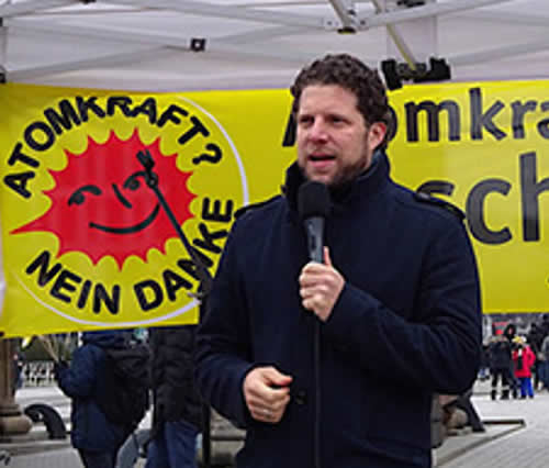 (写真 3月7日、ドイツ・ベルリンで「福島を忘れるな!」と訴えて行われた反原発デモではアレックス・ローゼンさんも発言に立った)