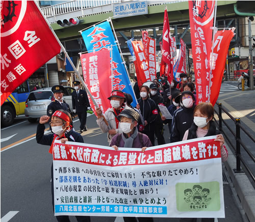 市営住宅から住民を追い出しムラを更地にする応能応益家賃制度に絶対反対を貫いてきた大阪・西郡(にしごおり)8家族への架空家賃の取り立てを許さない! 八尾市に対する第2波の抗議闘争が3月18日、8家族と、執行委員を先頭に大挙決起した八尾北医療センター労組の仲間を先頭に40人で闘われた。
