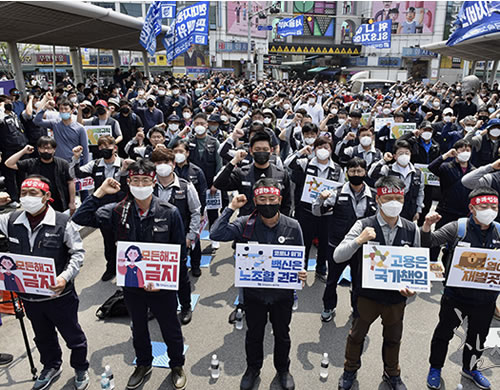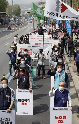韓国では3月、航空、観光、飲食業をはじめ22万人以上が雇用を失った。メーデーを前にした4月29日には京畿道利川市の物流倉庫新築工場で爆発火災事故が起こり、38人の建設労働者、移住労働者が亡くなった。その大部分が、電気・塗装・設備など下請けの非正規職労働者だった。