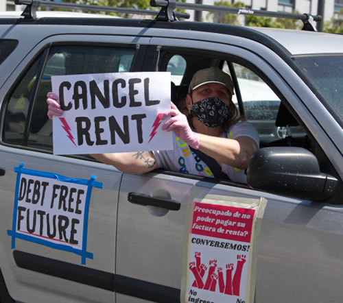 メーデーにあわせた統一行動として各地で行われた自動車キャラバンは、家賃や住宅ローン、光熱費、借金債務の不払いを訴え、「不動産や企業の利益ではなく、われわれの命を優先しろ!」「すべての人々に家を!」と声を上げた。