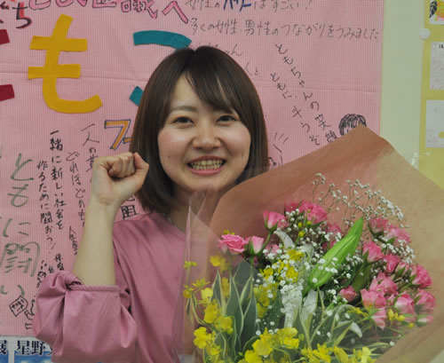 (写真 昨年4月、東京・杉並区議会議員選挙で当選を勝ち取り、笑顔でガッツポーズする洞口朋子さん)