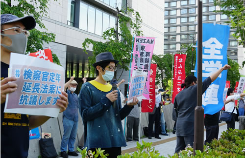 これに先立つ14日には、全学連の主催で国会前集会が行われた。緊急の呼びかけにもかかわらず約40人が参加、「#検察官定年延長法案に抗議します」ボードを掲げ、職場や地域の取り組みの報告と併せてマイクアピールを行った。