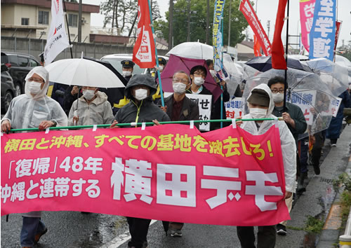 5月16日、米空軍横田基地のある東京・福生(ふっさ)市内で「横田と沖縄、すべての基地を撤去しろ!『復帰』48年沖縄と連帯する横田デモ」(主催/改憲・戦争阻止!大行進三多摩実行委員会)を70人の参加で打ち抜きました。