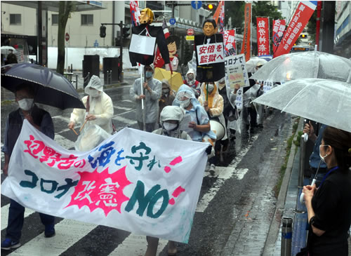 地元の弁護士は「検査をし、陽性の人たちを守り、隔離して治すことが一番大事。今日のような雨の日に傘を差し伸べるように、一番困っている人を助けるのが行政の役割ではないのか」と強調。「1月に発症者が出て以来、検査を意図的に抑えてきたことが、全国の介護福祉施設で80人以上の利用者が亡くなった原因だ」と訴え、介護現場や学童クラブの労働者が団結して闘いながら働いていることが紹介された。