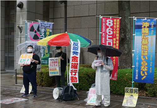 あいにくの雨の中、コロナの影響で自宅待機中の労働者や広島大生も結集。NAZENヒロシマの仲間が先頭に立って、福島原発事故と常磐線全線開通にみられる「帰還・被曝の強制」問題や、コロナ禍の中でも強行される沖縄・辺野古新基地建設、そして何よりも今コロナ危機の中で、安倍政権が労働者に矛盾を押しつける在り方はおかしいと訴えると、降りしきる雨の中でも多くの人がビラを受け取り、いつもの金曜行動より多い、100枚のビラを手渡すことができました。