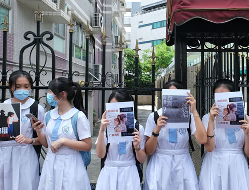 この日午後1時から九龍湾で「あなたと一緒にランチ」行動が、午後1時30分からは中高生による「人間の鎖」行動が行われた。音楽の試験で、学生が昨年来の闘いのなかで歌われてきた曲「香港に栄光あれ」を歌うことを禁止しなかった教師が解雇されたことに抗議し、この教師を励ますための行動だ。