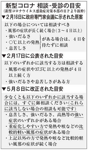 「37・5℃4日以上」という目安は2月17日から5月7日まで3カ月近くも実行されたが、批判や悲鳴が噴出したため、5月8日に見直しが発表された。「4日以上」の部分を「すぐに相談」に変え、原案に近い表現になった。遅きに失した。3カ月の間にどれほどの犠牲者が出たことか。