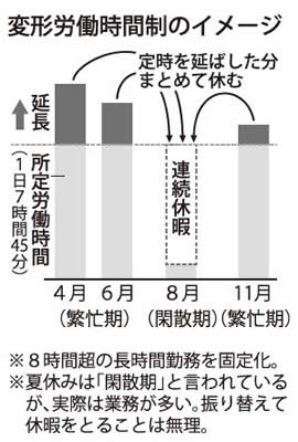 教員の所定労働時間は現在、7時間45分。繁忙期にこれを10時間に延長し、閑散期とされる夏休みなどに延長した分をまとめて休暇にするというものである。