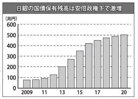 異次元金融緩和で日銀が供給した資金は、巨額の国家財政赤字を補塡(ほてん)することにも使われた。今年3月末時点で、発行残高1032兆円の長期国債のうち、約半分の487兆円が日銀によって保有されている。安倍政権発足直後の13年3月時点では、日銀が保有していた国債はその発行残高の13・2%だった。安倍政権下で実質的な国債の日銀引き受けは急速に進んだ(図)。昨年10月の消費税率10%への引き上げをきっかけに、日本の株価は下落に転じ、アベノミクスによる株高の演出は崩れつつあった。コロナはその状況を一変させた。前例のない額の資本救済費の支出がコロナを口実に正当化され、大資本は空前の富を手に入れた。生産が止まり労働者が大量に解雇される一方、株価はバブル的に膨れ上がっては急落する異常な状態が続いている。