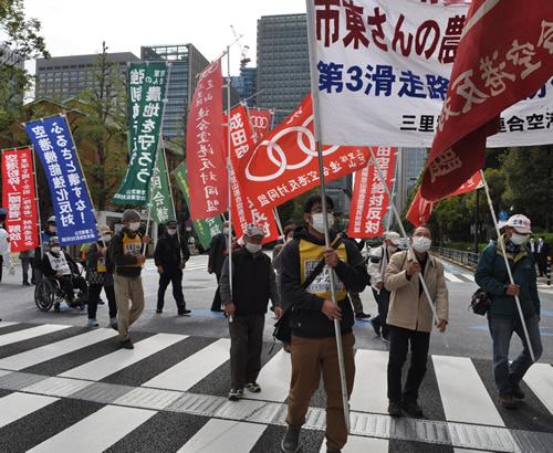 東峰の萩原富夫さんがマイクを握り、「今や成田空港は必要なくなった。農地に戻せ!」と断じ、官公庁や裁判所の労働者に向け、空港の反人民性と農地を守る闘いの正義を訴えた。