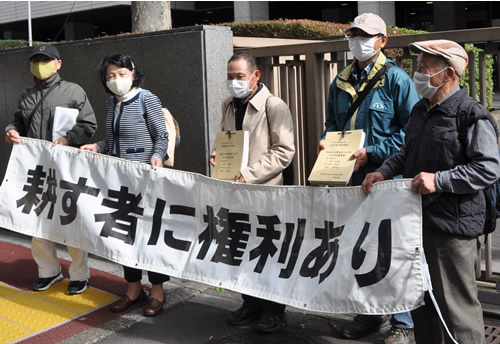デモ後、反対同盟はこの間全国から寄せられた「農地奪うな」の要望書653筆の合冊を携え、拍手で送られながら裁判所内へ向かった。16階の高裁第4民事部書記官室を訪れ、萩原さんが読み上げた上で要望書を提出した。