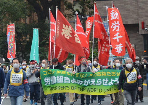動労総連合1047協議会の小玉忠憲代表は、「国鉄分割・民営化の功績」を理由に巨額の国費を投じて強行された元首相・中曽根康弘の国葬に怒りをたぎらせた。同副代表で動労総連合・九州委員長の羽廣憲さんは、ローソンの商品配送を請け負うロジテム九州で合同労組レイバーユニオン福岡の組合員が10月にストに立ったことに触れた。非正規職労働者の怒りを共有し、自らの解雇撤回闘争も「勝つまでやめない」と表明した。