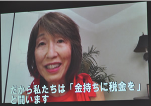 ビデオメッセージでは、台湾の桃園市産業総労働組合理事長の荘福凱さん、ドイツの鉄道労働者、アメリカのUTLA(ロサンゼルス統一教組)のアーリーン・イノウエさんが登場(写真)。コロナ対策を放棄するトランプ政権に代わって生徒たちの健康・安全を守るため職場の主導権を確保している取り組みを報告し、「がんばって!」と日本の仲間を激励した。