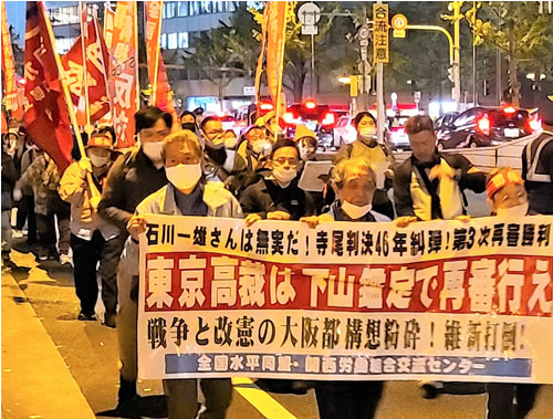 主催者あいさつで関西労組交流センターの赤田由行事務局長は、「大阪都構想に対する怒りが大阪市職員の中にあふれている。かつて大阪市職は狭山闘争で29分間の時限ストを闘った。都構想粉砕・狭山闘争で闘う労働組合をよみがえらせよう」と訴えた。