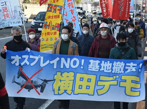「戦争反対、基地撤去」「夜間訓練やめろ」「コロナ情報開示しろ」「基地は今すぐロックダウン」——怒りに満ちたコールが米軍横田基地を直撃した。12月6日、東京都福生市で「落下物事故を許さない オスプレイいらない 基地を撤去しろ 横田デモ」が80人の参加でかちとられた。