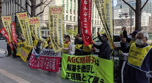 3月16日正午、東京・丸の内のAGC本社前に「AGC旧旭硝子韓国工場で不当解雇された組合員22人全員を正規職雇用せよ」と書かれたのぼりが林立し、春風にたなびいた。旭非正規職支会支援共闘会議が声明「AGCは労組支会長外しの和解案を撤回しろ!」を発し、AGC本社前に登場したのだ。