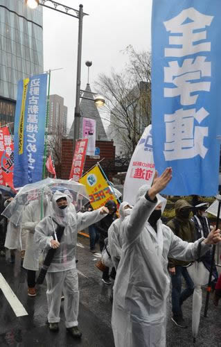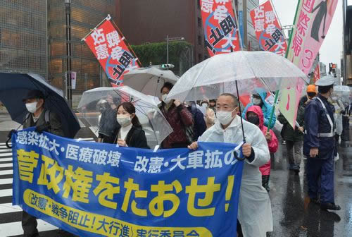 「スガをたおせ!」「オリンピックやめろ!」「改憲・戦争絶対反対!」----3月21日、「改憲・戦争阻止!大行進」実行委員会が呼びかけた集会とデモに、悪天候にもかかわらず520人が結集し、銀座の街に怒りのコールを響かせた。