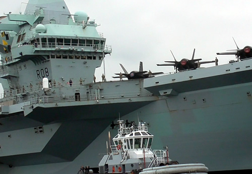小雨交じりの中、午後1時前に海上自衛隊の護衛艦「おおなみ」が先導して「クイーン・エリザベス」の姿が見えました。接近するに従って、F35B戦闘機18機を搭載していることが分かってきました。日英共同訓練後、そのまま寄港したのでしょう。