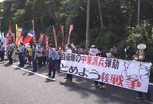 (写真 海上自衛隊舞鶴基地で行われている第6次中東派兵部隊の出国式に抗議するデモ隊。コールが基地内に響きわたった【9月5日】)